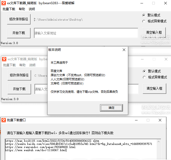3、新增支持原创力、文库吧、人人文库的下载支持(仅供测试,不完善,详见软件说明)